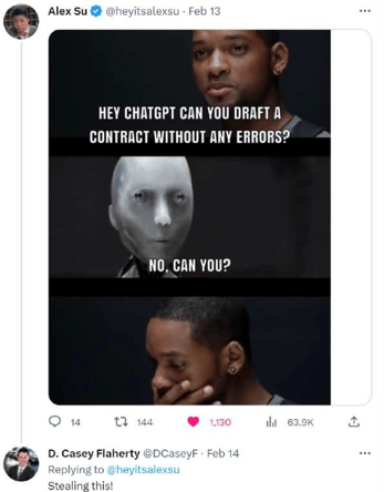 About a week after my series, the usually informed and informative Jack Shepherd published Chat GPT for Contract Drafting: AI v. Templates, which treats ChatGPT as a stand-in for AI and then AI as somehow incompatible with templates (it is all there in the title, but you can read the piece for yourself). This was followed a few days later by So How Good is ChatGPT at Drafting Contracts?, which, to be fair, offers all the correct caveats in its conclusion. The cacophony resulted in webinars on Legal Considerations for ChatGPT in Law Firms and articles like As More Law Firms Leverage ChatGPT, Few Have Internal Policies Regarding Its Use—which were necessary but also serve to reinforce the monomania.