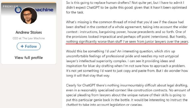 - "AI will replace all lawyers" is almost certainly an embarrassingly bad take for the foreseeable future. But "AI will not displace any lawyers because of what ChatGPT currently does poorly" is undoubtedly a bad take today.
